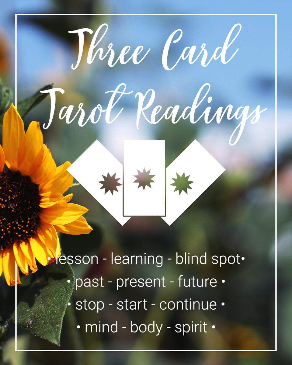 Three-card spreads are quick and versatile, offering some insight on a particular topic or problem. Each card in a three-card spread stands for that element in the spread. You'll get a description of the meaning of each card, how they relate to their placement, and how they relate to other cards, as well as a summary of the spread taken as a whole.Three card reading options are:• lesson - learning - blind spot