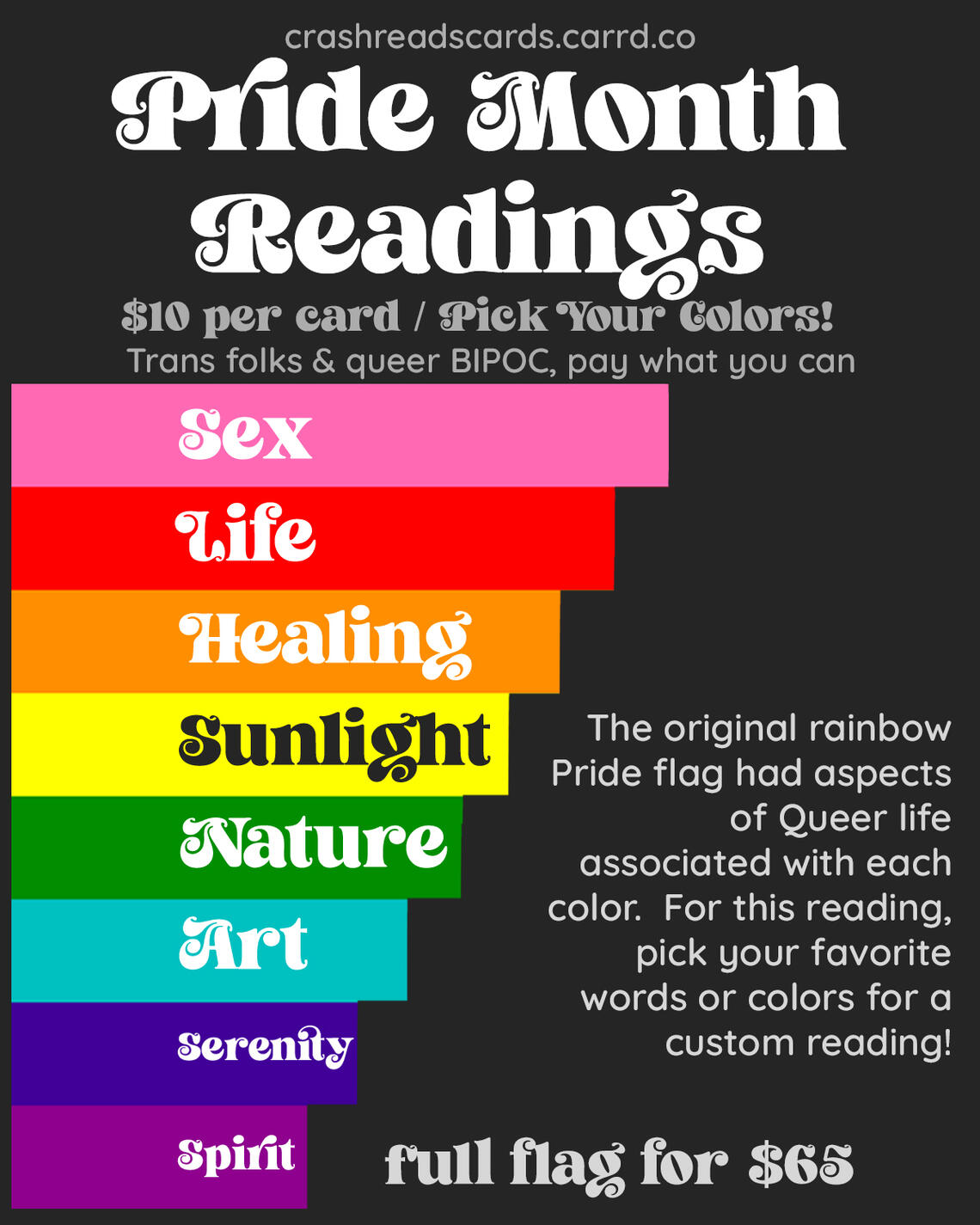 The original rainbow Pride flag had aspects of Queer life asociated with each colors. Mix and match your favorite colors or aspects for a personalized reading, or get the whole flag!Trans folks and queer BIPOC pay what you can for asynchronous version of this reading! If you're looking for the discount code to pay less than the shop minimum, email me and I will send you the code!